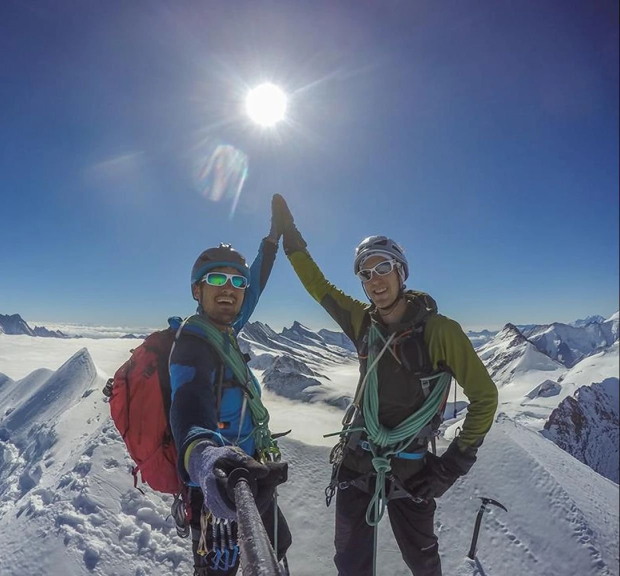 When you step onto the Traverse of the Gods, the name finally makes sense. With so much air beneath your feet, it really does feel like you're in heaven. The higher we move over the Spider and toward the summit, the stronger the sense of wonder becomes. As we move across the Spider and up towards the top, the feeling of wonder grows and grows.
