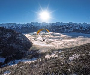 A few steps down the snowy slope and you are airborne. The flight lasts 10 to 20 minutes, taking you over Interlaken, Lake Thun, and Lake Brienz. You can enjoy a calm glide or opt for more action with spirals and wingovers. Landing is right in the center of Interlaken on the Höhematte.