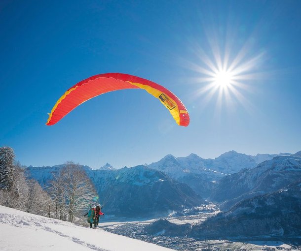 The Big Blue Winter flight starts in Beatenberg. After a brief preparation, you will fly for 10–20 minutes over Interlaken, the snow-covered Jungfrau region, and the two lakes. Landing takes place right in the center of Interlaken on the Höhematte. Photo service optional. Total duration around 1.5 hours including transfer.