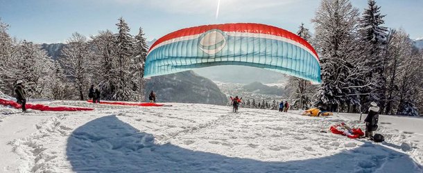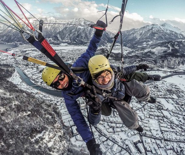 A few steps down the slope and you're airborne. The flight lasts 10 to 20 minutes. You see Interlaken, the Alps, and the two lakes in a winter panorama. On request, your pilot can fly smoothly or perform maneuvers like spirals. The landing takes place right in Interlaken on the Höhematte.